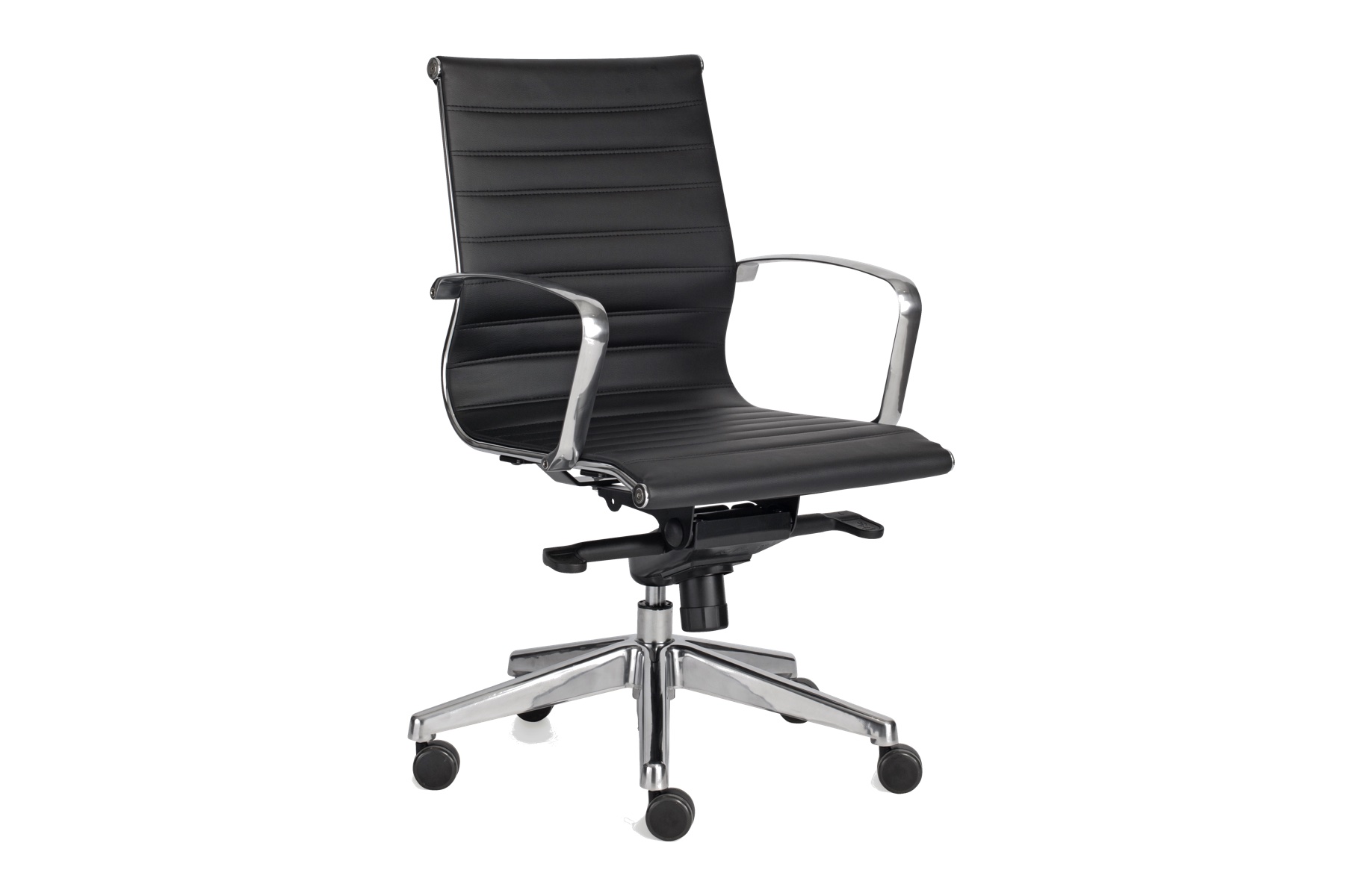 Mustast kunstnahast kontoritool, mille stiilset välimust täiendavad kroomitud detailid.